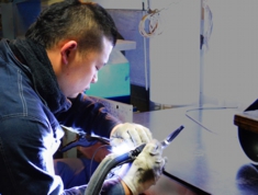 | 10年前、京都市街地から車で一時間。山あいに建つプレハブ小屋の中で、一人孤独に作品を作っていました。壁も天井も薄くて所々むき出しになっていた室内は、気温が夏場は45度を超えて、冬には-7度になりました。夏の暑い日に溶接作業をしていると、汗で作業着がビショビショに濡れてしまい汗の水分を伝って全身が感電することがありました。また、冬の寒い日は、あらゆる隙間から冷気が入り込み、室内に置いているペットボトルの水が凍る日もありました。8時間会社勤めした後、アトリエへの移動中に車内で食事を済ませて、9時間アトリエで制作、1日合計17時間1ヶ月当たり500時間仕事していた事を覚えています。 |